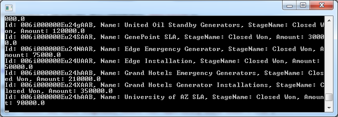 The final thing to do is to write a query and see the result. For my example I’m going to query the Opportunity object and return all of the objects that are “Won”.