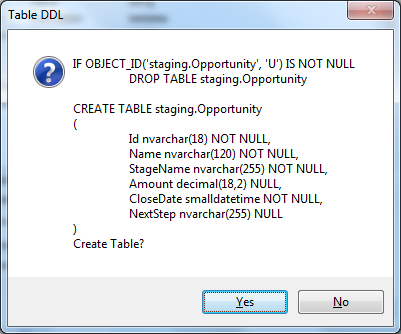 As I was re-working my packages, I was also recreating a lot of the staging tables. This was a very tedious process, as I had to go back and forth looking at the mapping of SalesForce types to their counterpart in SQL Server.