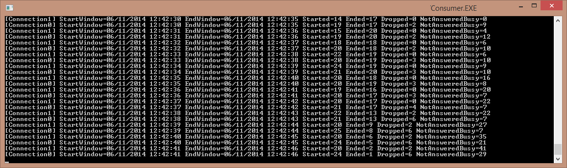 On a random schedule it will generate a number of CallStarted, CallEnded, CallDropped, CallNotAnsweredBusy events and publishes them to the Event Hub (CallStatsIn)