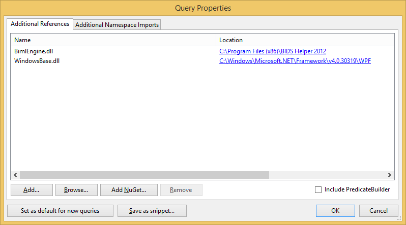 The first thing that you will need to do is add the assembly references. Click the Browse button and locate BimlEngine.dll (for me this is in C:\Program Files (x86)\BIDS Helper 2012). I also added a reference to WindowsBase.dll which you can do by clicking the Add button then searching for that assembly.