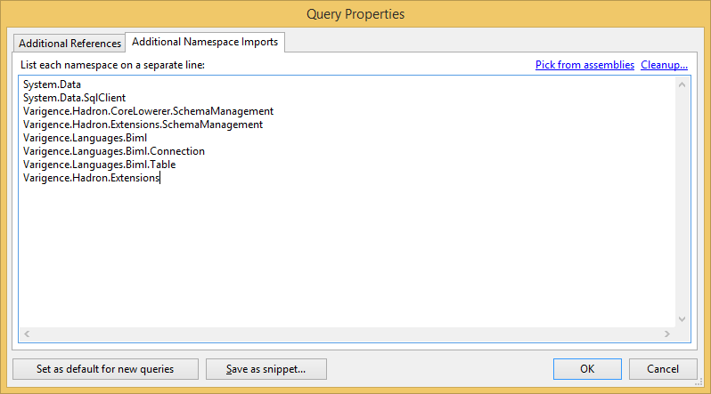 To be able to use the BIML engine and Varigence extensions we’ll need to add a reference to the required assemblies and their namespaces. To do that, press F4, this will bring up the Query Properties window.