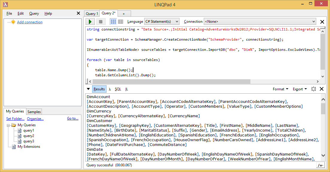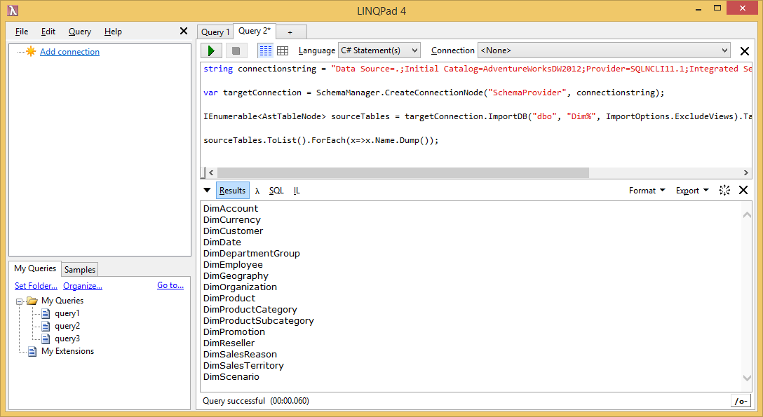 This will simply use the SchemaManager and ImportDB extension methods provided by Varigence to dump the names of all the tables in the AdventureWorksDW2012 dbo schema that start with Dim