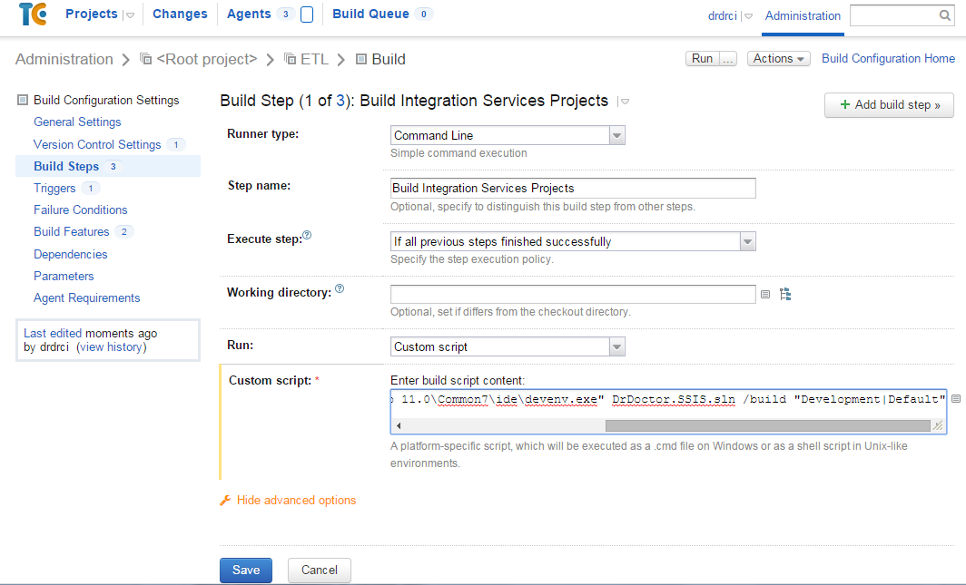 In the custom script I put in the full path to devenv.exe, our SSIS projects are built in SSDT BI 2012 (Visual Studio 2012 shell) so I’m using that version of devenv.exe on the build server.