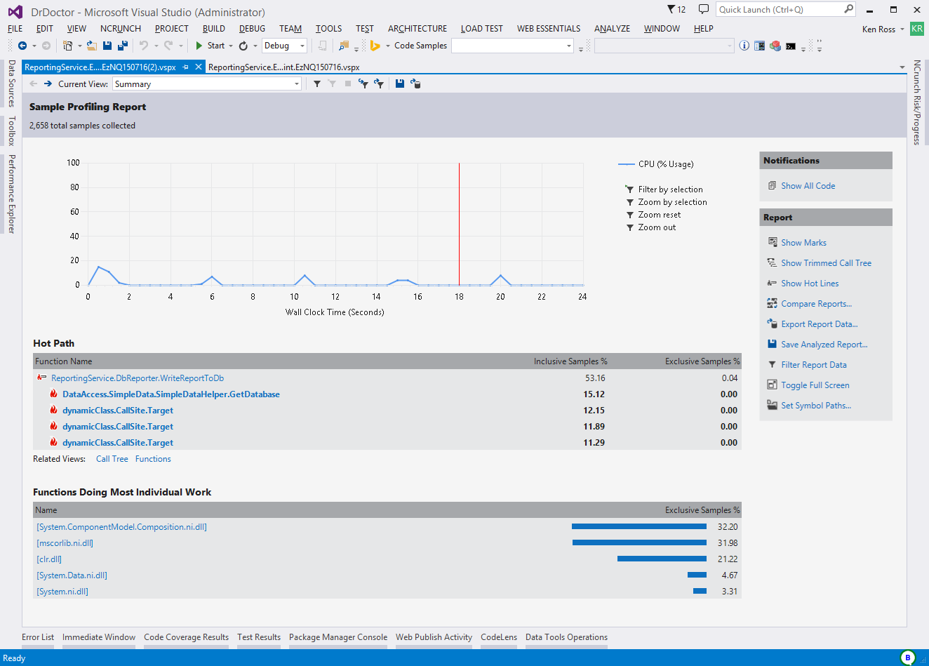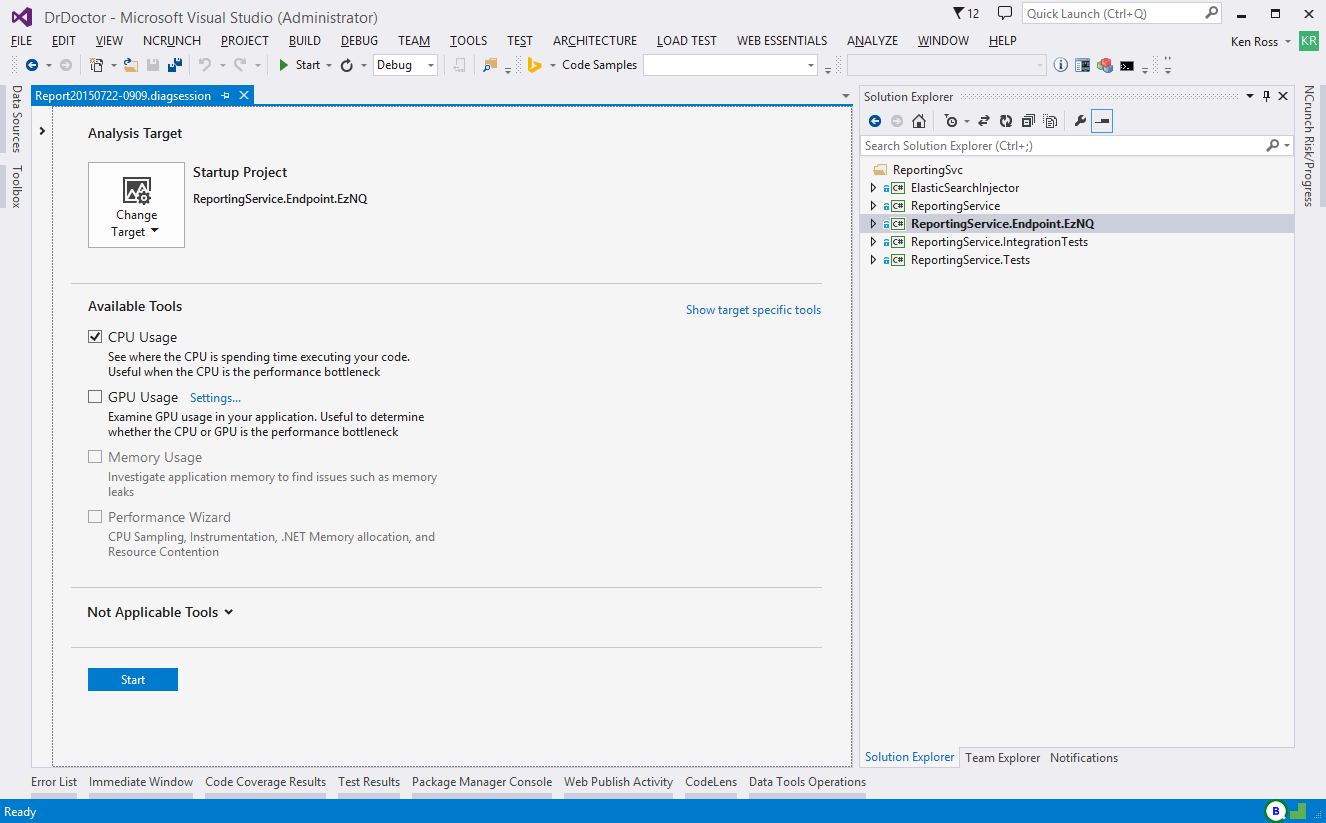 I then selected Performance Wizard under Available Tools and then clicked the Start button. This brings up a dialog where you can select a few options, I selected CPU sampling as the profiling method, then the Reporting Service project as the profiling target, then clicked finished. The Reporting service then started and Visual Studio started profiling, after about 5 minutes I stopped the profiling.
