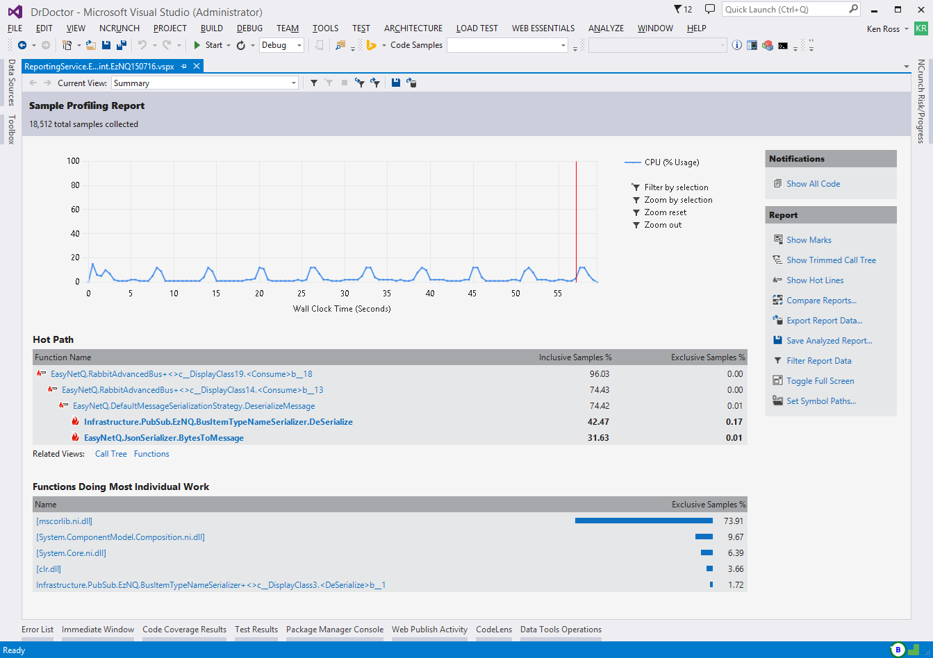To measure the performance I first queued up a significant number of messages for the reporting service to process then started the Visual Studio Profiler.