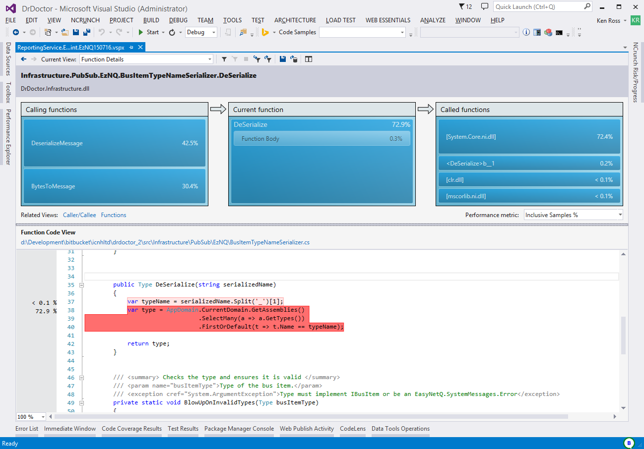 As you can see from the Hot Path, the Infrastructure.PubSub.EzNQ.BusItemTypeNameSerializer.DeSerialize method gets called lot and is potentially very slow! The good news here is that this is our code, which means I can click on this row and visual studio will take me to this method, and even highlight the expensive code.