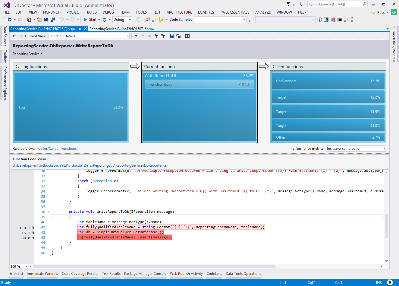 Clicking onto the ReportingService.DbReporter.WriteReportToDb row brings up the code for that method
