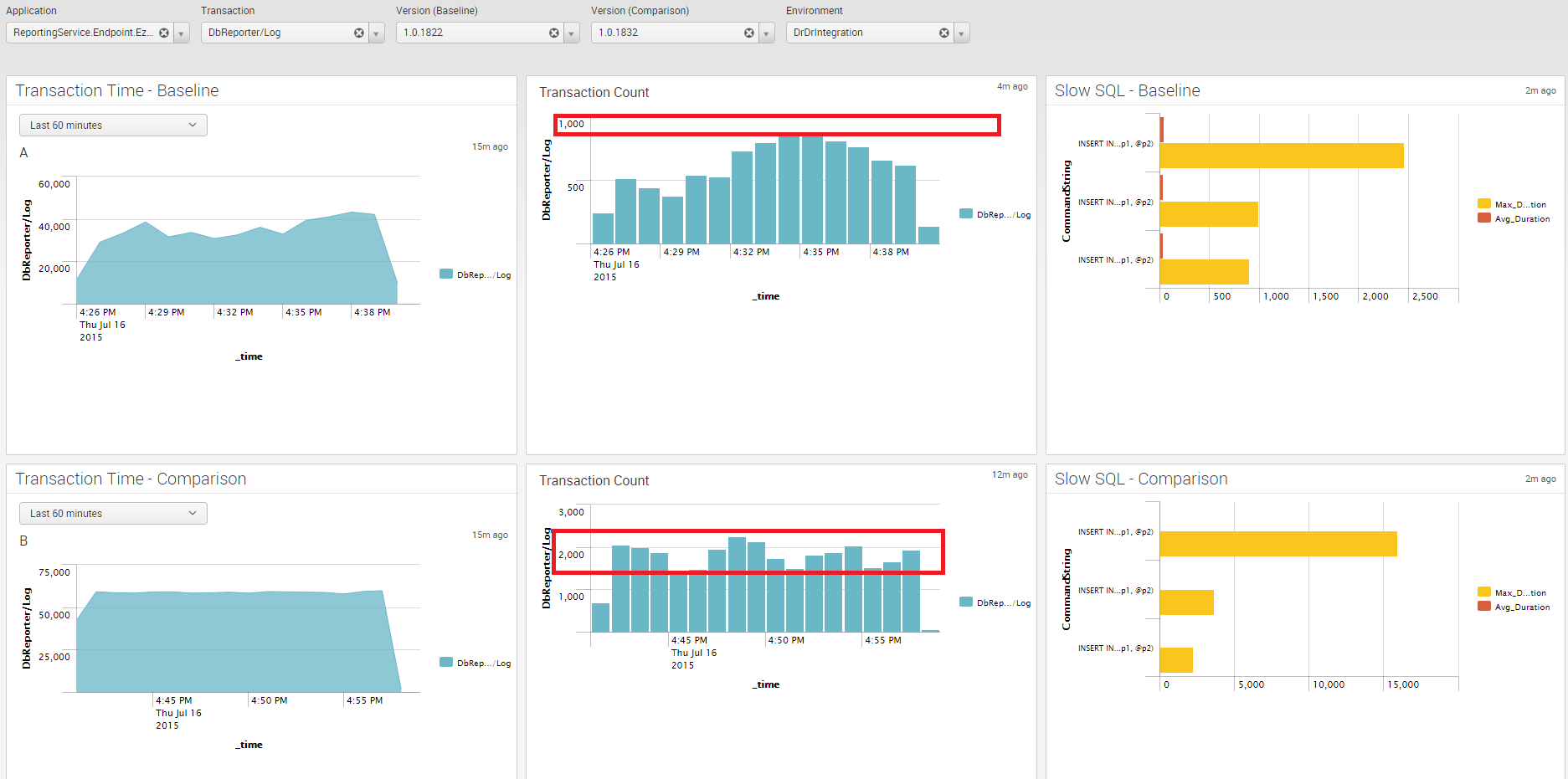 In Splunk I created the following dashboard, which allows me or any of my fellow developers at DrDoctor to select an Application and Transaction and then a baseline and comparison version.