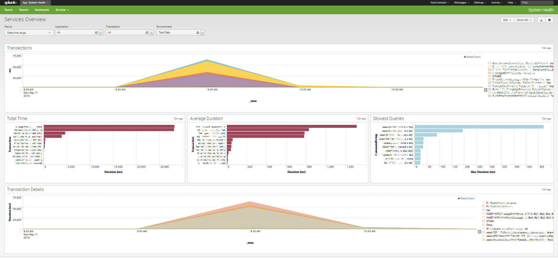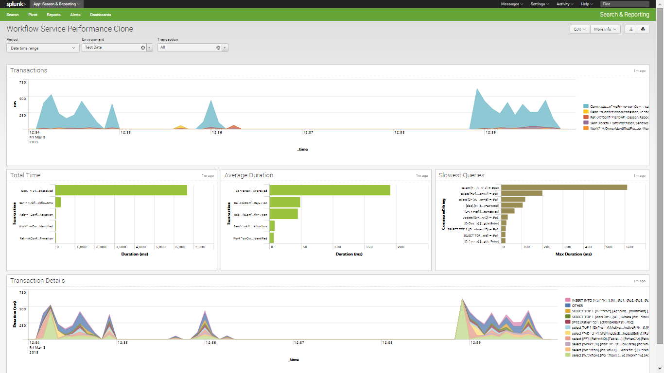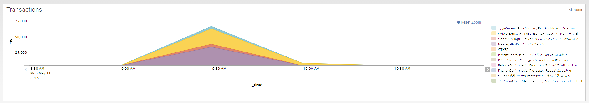 The last chart is a stacked area chart of time spent on the different actions that were measured, over time. This is more useful when looked at in the context of a single transaction type.