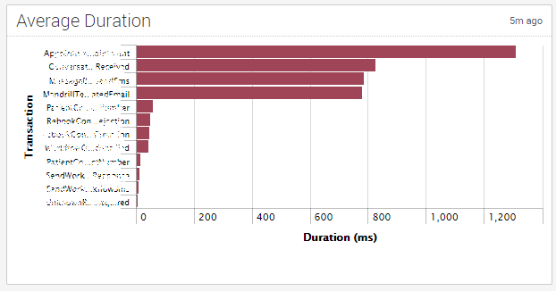The next chart shows the average duration of a transaction, this in the context of the previous chart could start to highlight potential problem areas. A variation on this chart would be to show it stacked with the number of times the transaction was executed.