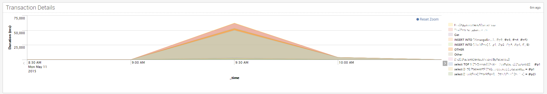 The first one is a stacked area chart, which shows the total time spent for a transaction over time. High values on this chart aren’t necessarily indicative of performance problems, as it could just be that we were experiencing high throughput of a certain transaction.