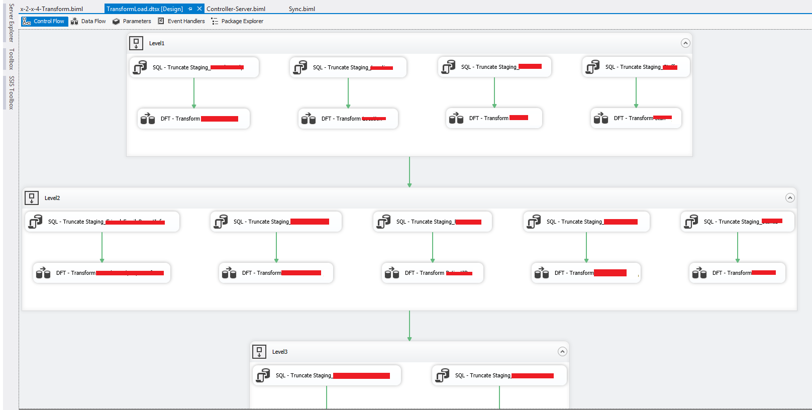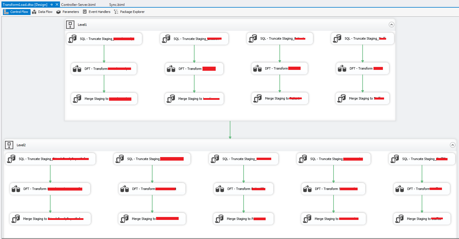 What I had to do was combine the Transform and Load packages into a single one. I could have gone through and copy, pasted, joined up and fixed any problems for each and every one (there were about 30+ transforms), but that would have taken a while and been a very boring task. Instead I made a very minor change to my Biml package and then regenerated the package.