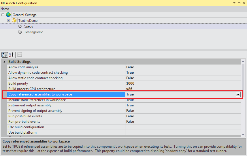 Back in the NCrunch configuration window, under Build Settings set “Copy referenced assemblies to workspace” to True