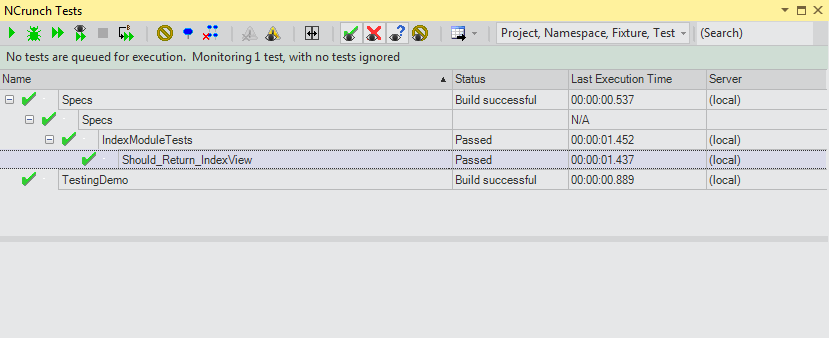 One of the greatest things about Nancy vs ASP.Net MVC is that everything can be tested, and we have tests for pretty much all of our Modules (read Controllers) as well as our Views. NCrunch does some serious magic when it comes to running your test intelligently in parallel. Up until a few days ago I couldn’t figure out how to get my tests to work.