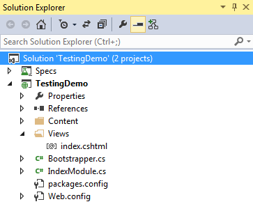 In the Specs project I reference the TestingDemo project and then added the Nancy.Testing and Nancy Razor View Engine (since I’m testing Razor views) NuGet packages.