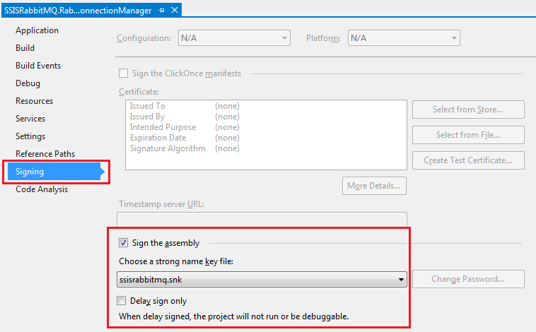 Tick the checkbox “Sign the assembly”, select <New…"> from the “Choose a strong name key file” drop down, and I created one called ssisrabbitmq.snk
