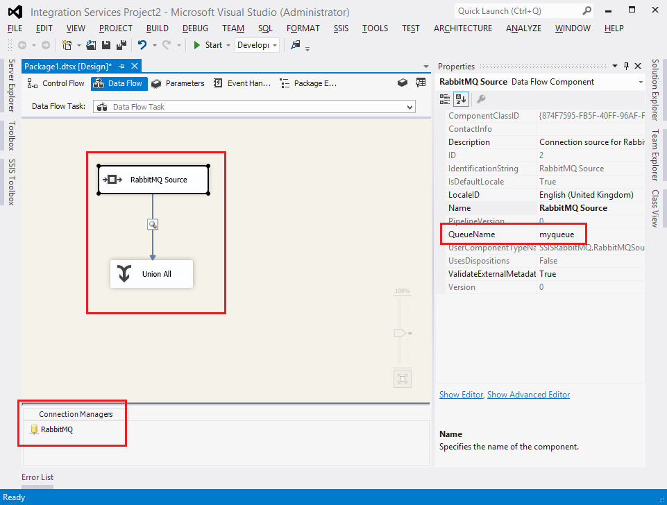 Below you can see the data flow tasks highlighted in the middle of the screen, to the right is the QueueName property and down the bottom is the RabbitMQ Connection Manager.