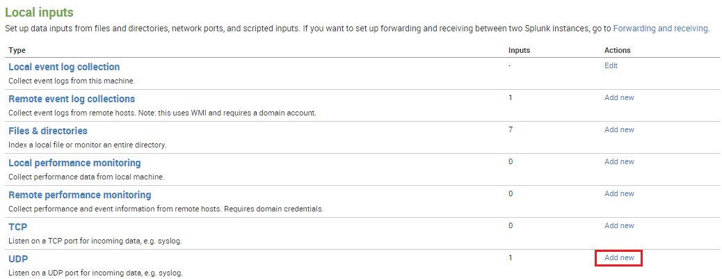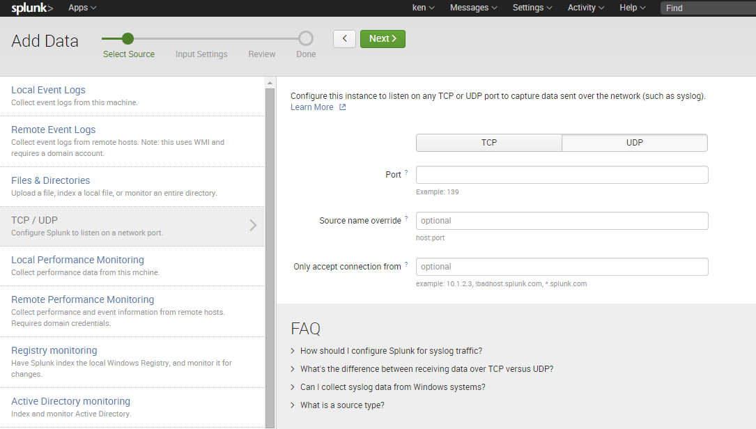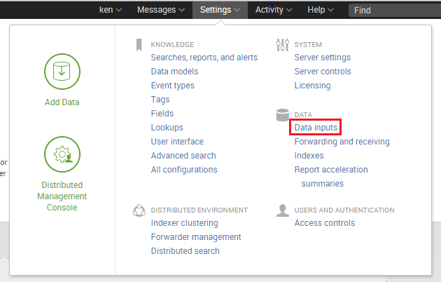 From the Splunk settings, select Data Inputs