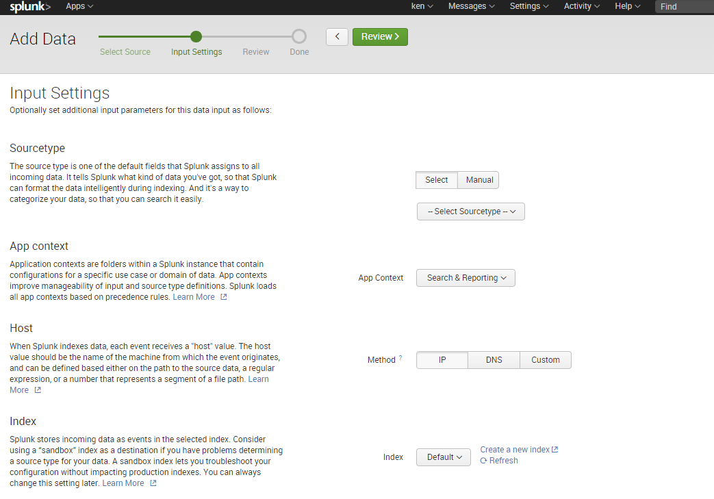 The next page “Input Settings” let you (optionally) specify various things about the data you are going to be sending. There are two particularly useful settings here, the sourcetype and index