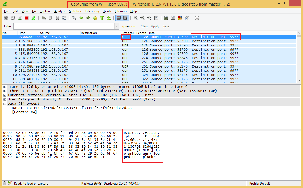 If you need to verify that log4net is sending events over UDP you can use Wireshark. Here I have set it up to capture packets from my wifi adapter and monitoring port 9977
