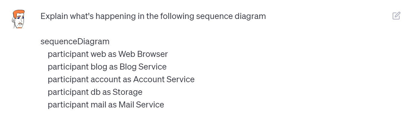 So instead of reaching for pen and paper, I headed over to ChatGPT. I won’t share the exact details of the system I wanted to generate a sequence diagram for (since that’s work product) but here’s an example.