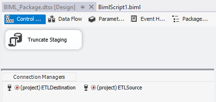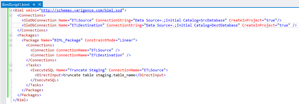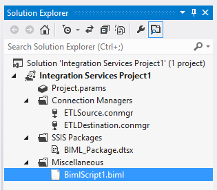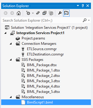 As you can see, the XML is very expressive which makes it very easy to read and understand. After running the Biml generation tool the following appears (as if by magic) in the Integration Services project.