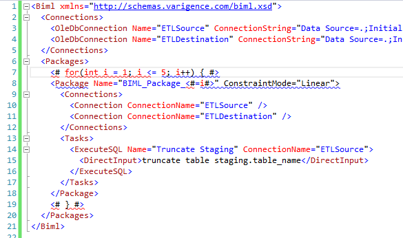 What makes Biml really powerful is the ability to mix C# with the Biml code to generate dynamic packages. Take another trivial example: